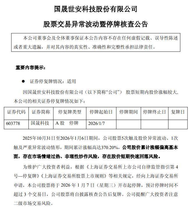 国晟科技1月6日公告,因公司股票短期内股价涨幅较大,2025年10月31日至2026年1月6日期间,公司股票5次触及股价异常波动、1次触及严重异常波动情形,期间累计涨幅高达370.20%,公司股价累计涨幅偏离基本面,存在市场情绪过热、非理性炒作风险,存在股价短期快速回落风险。为维护广大投资者利益,根据《上海证券交易所上市公司自律监管指引第4号—停复牌》《上海证券交易所股票上市规则》等相关规定,经向上海证券交易所申请,本公司股票将于2026年1月7日(星期三)开市起停牌,预计停牌时间不超过3个交易日,公司股票将自披露核查公告后复牌。